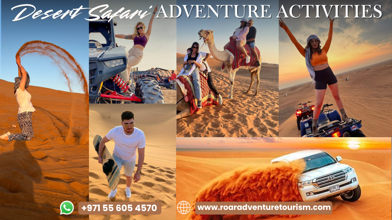 VIP Desert Safari Dubai Tour Operator Roar Adventure Tourism Evening Desert Safari, Morning VIP Private Choose Camel Ride Sandboarding Quad Bike or Dune Buggy Adventure, Roar Adventure Tourism LLC offers VIP Desert Safari Dubai Tours starting 79 AED per person. Gold, Platinum Packages 4x4 dune bashing on Lahbab red dunes with expert drivers. Enjoy camel rides, sandboarding, quad biking, and private or group safari options. Evening safaris feature a traditional Bedouin camp with BBQ Buffet dinner non-veg veg dishes, Arabic costumes & Falcon for photography, henna for Ladies, shisha, Premium siting and cultural shows such as belly dance, Tanoura, and fire performances. Tours include hotel pickup from Dubai & Sharjah. Perfect for families, couples, groups seeking authentic Arabian desert adventures with expert guides. We also offer Dubai Abu Dhabi City Tours, Hatta Mountain sightseeing Cruise Dinner in Marina